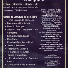 Leitura Oracular através de método exclusivo para leitura do Semestre. Dividido em: Cartas de Estrutura do Semestre Tema Central do Semestre Movimento Dominante Desafio Principal Aliado ou Recurso do Semestre Linha de Aprendizado Resultado Provável/Tendência Final Amor e Relações Propósito / Carreira Finanças e Recursos Saúde e Vitalidade Espiritualidade / Conexão Interna Casa, Localidade e Família Permite a escolha de dois portais mais aprofundados, podendo ser: PORTAL PROFISSIONAL: (Oportunidade Emergente/ Habilidade ou Talento a Desenvolver / Resultado Profissional Mais Provável) PORTAL AFETIVO: (Estado Emocional do Movimento/ Dinâmica Relacional/Desfecho ou Direção Afetiva) PORTAL DO PROPÓSITO: Chamado da Alma/ Alinhamento Necessário / Linha do Destino PORTAL DE REAVALIAÇÃO: O que foi aprendido/O que foi deixado inacabado/ O que deve ser levado adiante + livro do autoconhecimento +7 perguntas elaboradas pelo consulente
